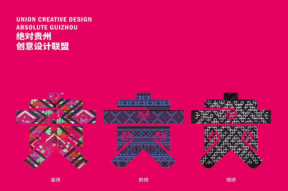 绝对贵州logo,采用了"贵"字与贵州特有的黔绣,苗绣,锡绣,蜡染等绣织方式和色彩呈现相结合,简化"贵"字笔画,强化视觉识别性,使之既具备现代风也有贵州风.