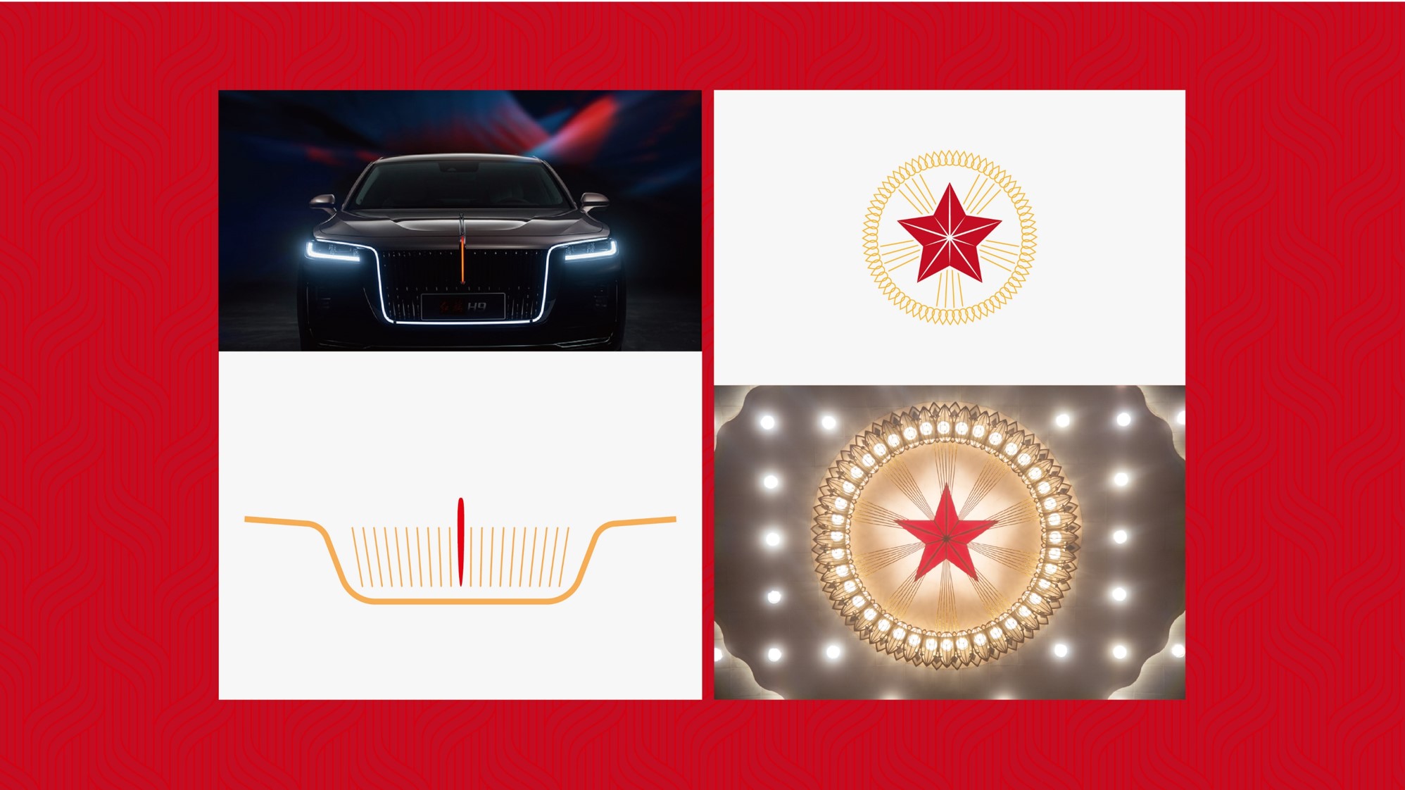 红旗在我们心目中一直是接待元首的礼宾车,而红旗十九酒则是接待普罗大众的礼宾酒,为表达红旗十九礼宾酒的特点在酒包装的设计中我们提取了的红旗H9的车头中网造型为基础元素,寓意为“高山飞瀑,中流砥柱”。